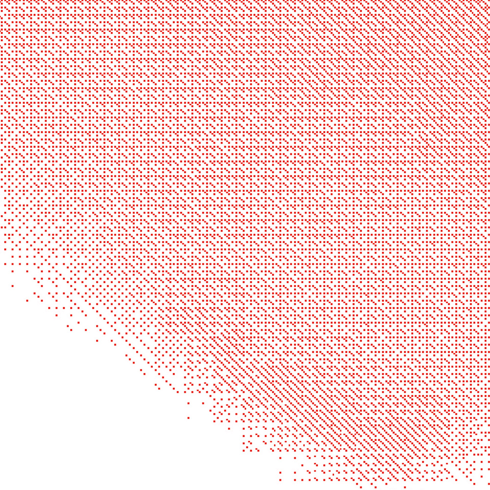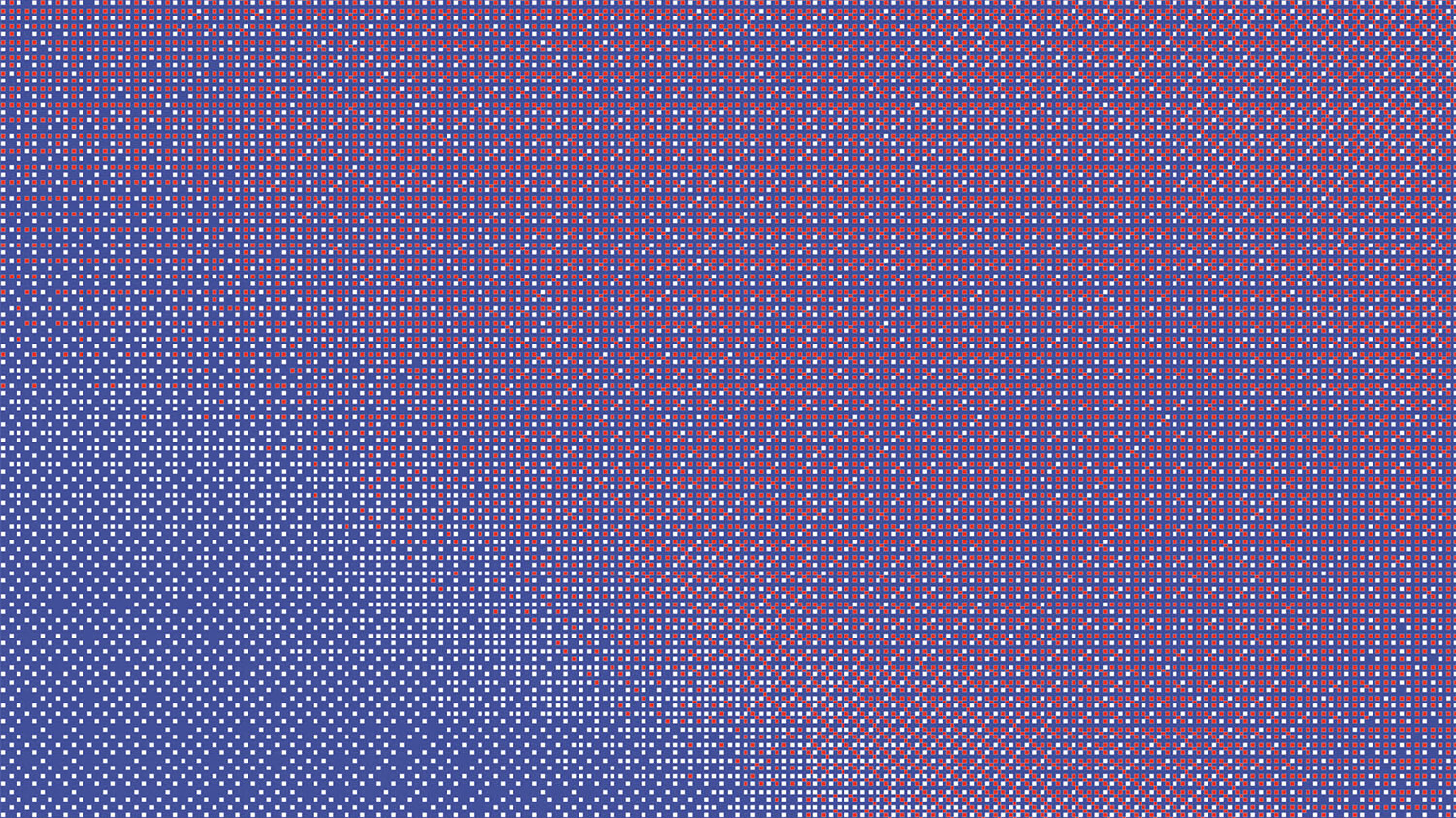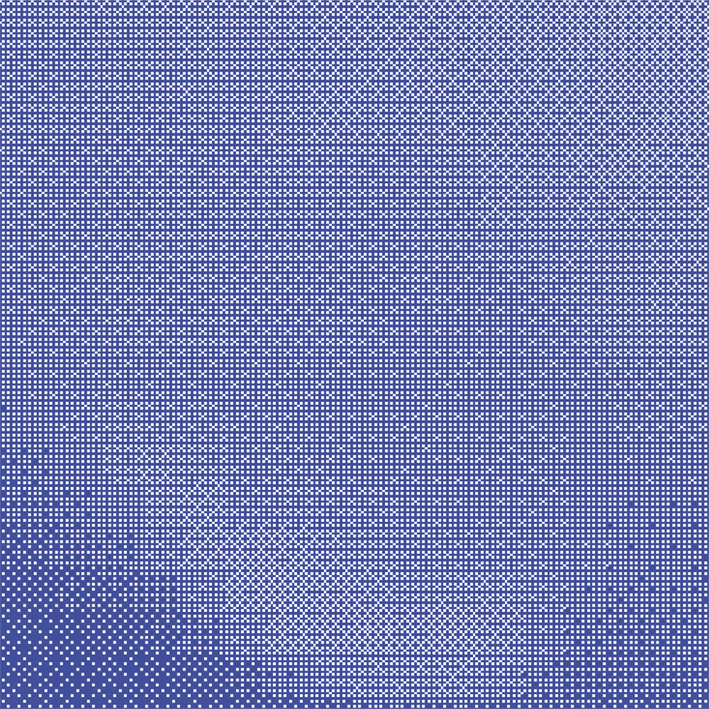 Door de kleuren in wisselende verhoudingen pixel voor pixel naast elkaar te plaatsen, soms iets meer rood, dan weer iets meer blauw, ontstaat er een optisch verloop dat er niet écht is. Geen digitale gradient, maar een subtiel spel van contrast en perceptie. Wat op afstand een zachte kleurverschuiving lijkt, blijkt bij extreme vergroting niets meer dan een raster van zuivere kleuren. We kunnen dit geheel dan ook met enkel twee Pantone-kleuren printen. Pas als je diep inzoomt, op het niveau van individuele pixels, zie je wat er werkelijk gebeurt.